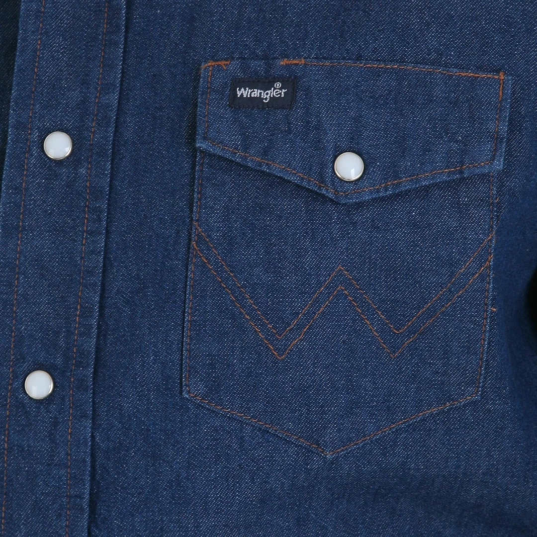 To tackle projects both on and off the job, youll want a sturdy shirt that can handle everything you throw at it. Luckily, the Wrangler® Cowboy Cut® work shirt is a tried-and-true staple that performs from dawn until dusk. Our mens Cowboy Cut® rigid denim long sleeve shirt features a classic fit as well as a 100% cotton construction thats untouched, untreated, and unwashed. Plus, it comes with all the authentic Wrangler® details you know and trust, including Western front and back yokes, spade flap pockets with snap closures, and three-snap cuffs. Complete your look by pairing this Cowboy Cut® work Western rigid denim shirt with our Cowboy Cut® jeans.Long Live Cowboys®
