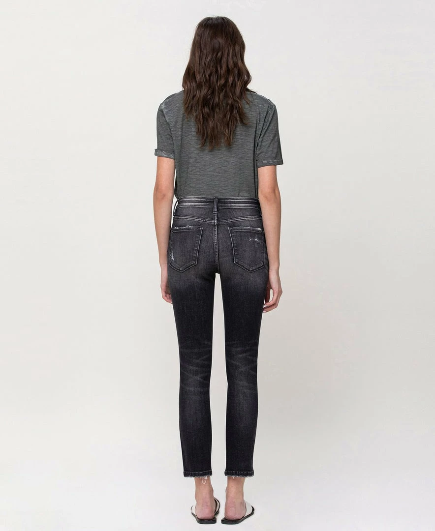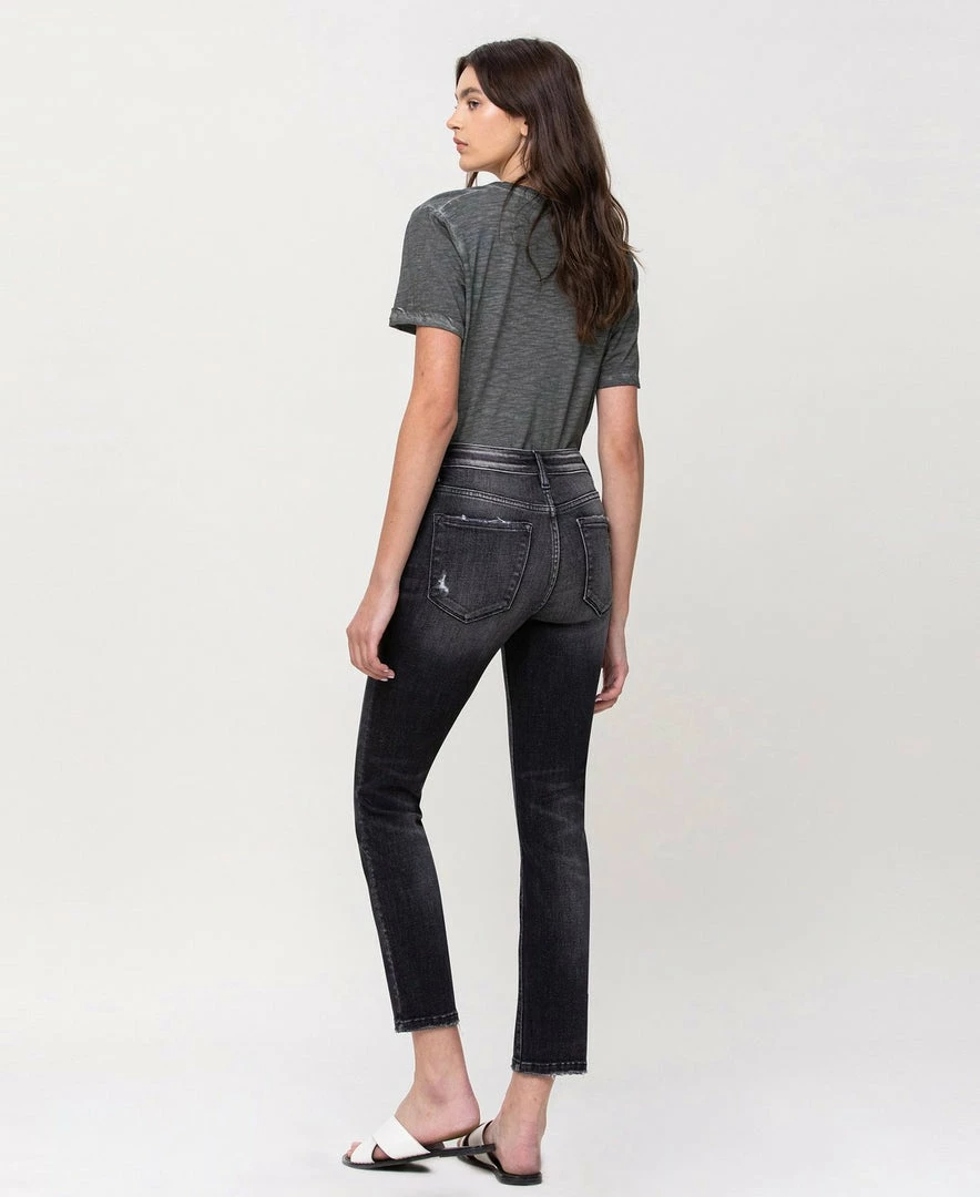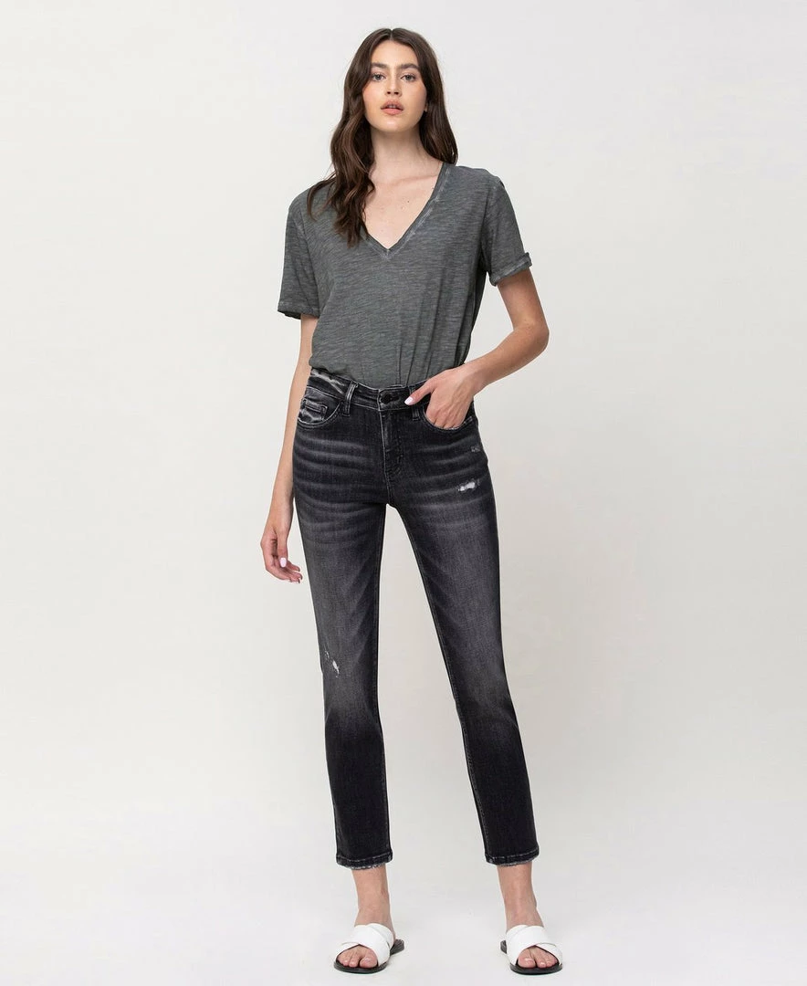 - Comfort-stretch denim, whiskering, subtle fading, zip fly closure, ankle length, and mid rise waist